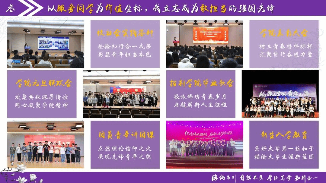 她先后担任9项学生工作,坚持服务同学。作为主要负责人参与承办新生入学教育、新生诗朗决赛等6项校级大型活动,策划举办控制学院毕业歌会、学院表彰大会等8场活动。