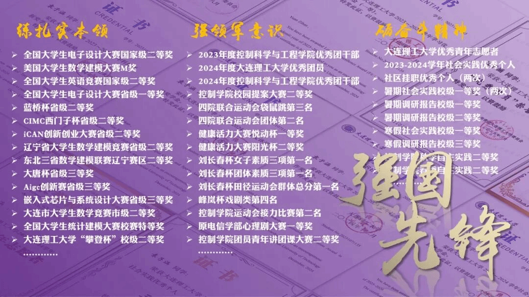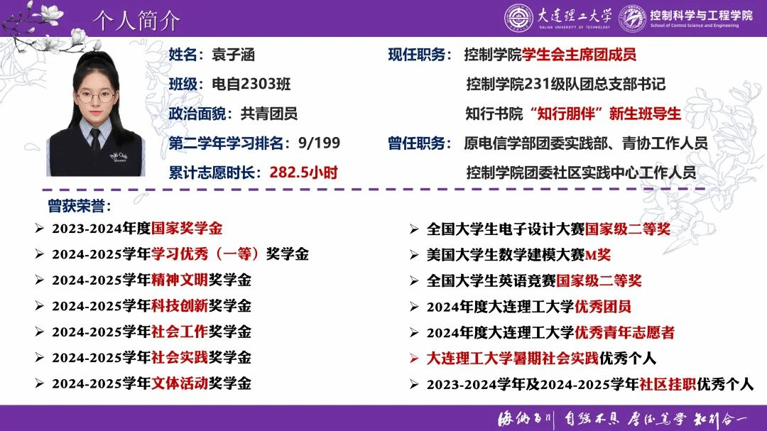 控制科学与工程学院2023级本科生袁子涵获2024-2025学年大连理工大学优秀学生标兵(全校仅10人)。
