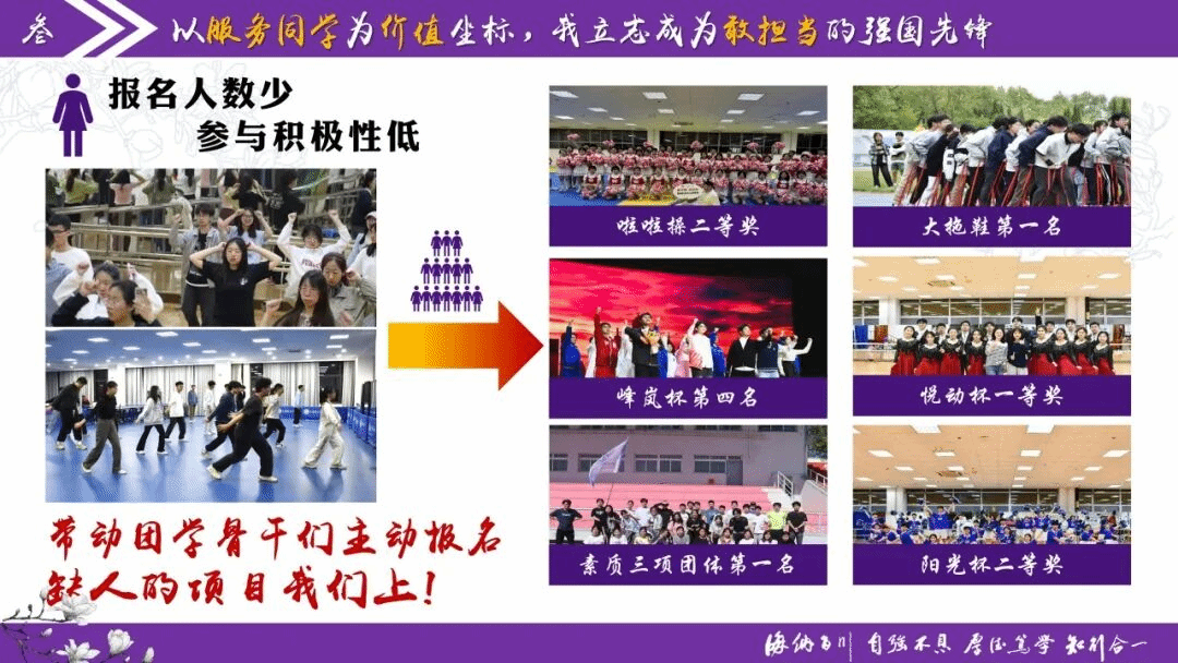 学院拆分初期,大型文体赛事报名人数少,参与积极性低,作为主席团成员,她带动团学骨干们主动报名。舞蹈室镜子前笨拙的尝试,操场上顶着夕阳一次次冲破终点。最终,她的参与,带动了更多同学加入,学院从报名困难到收获多项团体第一名。服务同学、并肩作战的过程中,她也有幸收获了全面发展的自己。