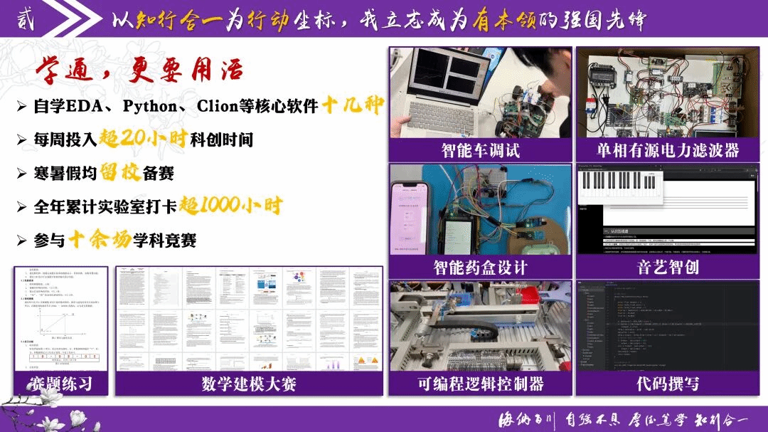学通,更要用活,她将挤出来的学习时间投入到科技创新中,自学EDA、Python、Clion等十几种核心软件,每周投入科创时间超20小时,寒暑假均留校备赛,全年累计实验室打卡超1000小时。获得全国大学生电子设计大赛国家二等奖等国家级奖项3项,省级奖项10项。