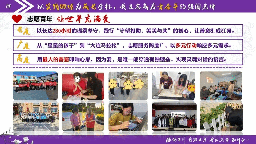 从关爱自闭症儿童到大连马拉松志愿者,她将青春与奉献相连,志愿时长超280小时,获评大连理工大学优秀青年志愿者。