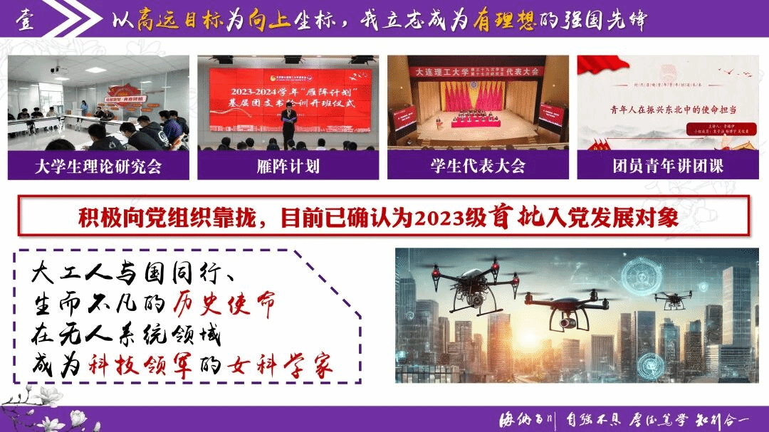 自入学以来,她积极向党组织靠拢,第一时间提交入党申请书,主动加入大学生理论研究会,参与“雁阵计划”培训,目前已确认为2023级首批入党发展对象。她感受了大工人与国同行、生而不凡的历史使命,以高远目标为向上坐标,锚定学术大师,希望能在无人系统领域成为杰出女科学家。