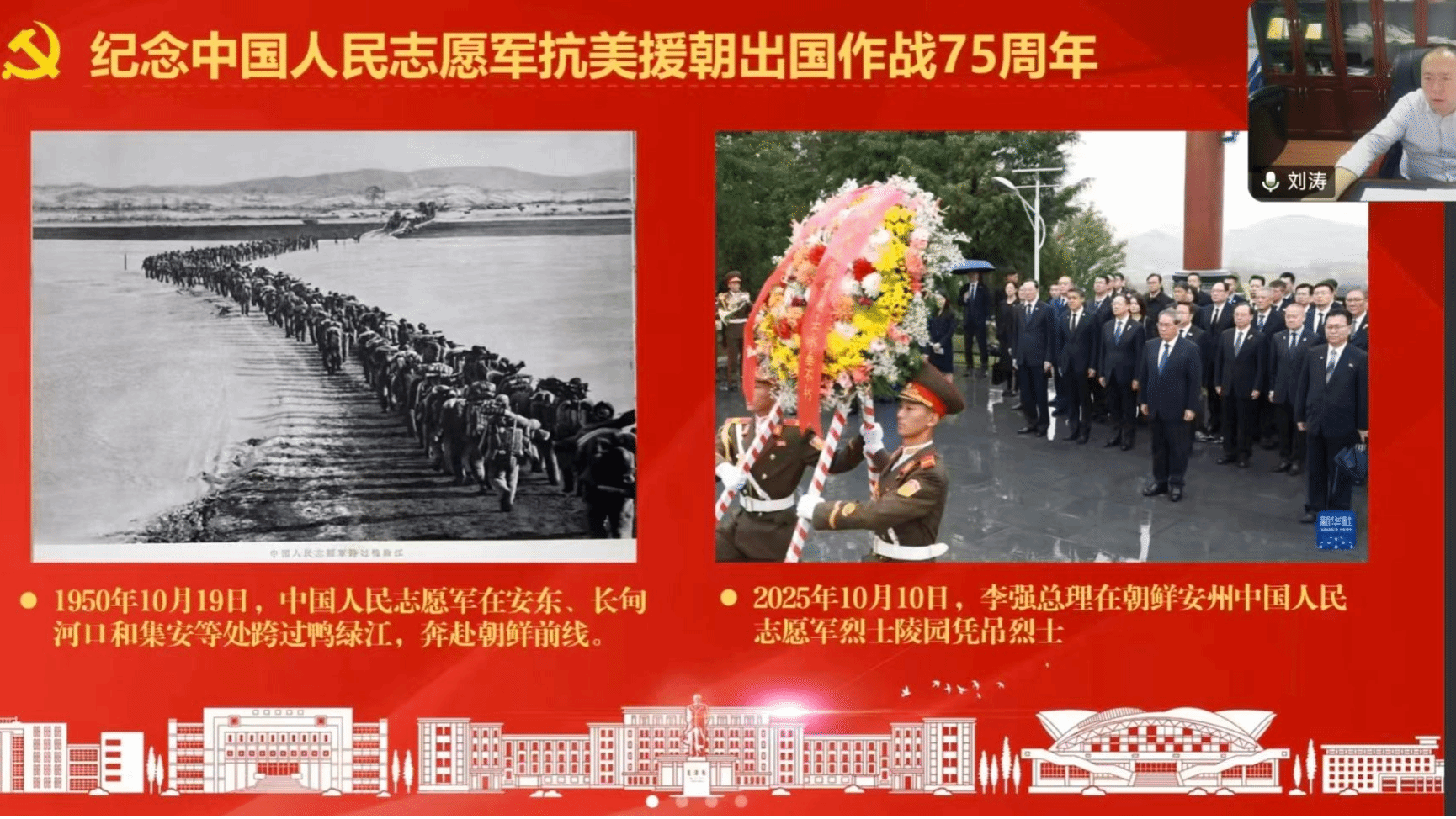 先进控制与计算机控制研究所师生纵向党支部以线上会议的形式开展学习活动。主讲人刘涛老师通过援引史实与博物馆云参观,带领大家回顾了十四年抗战和三年抗美援朝战争的历史,强调了党在战争中的领导作用,激励青年学子牢记幸福生活来之不易,坚定科研报国志向。