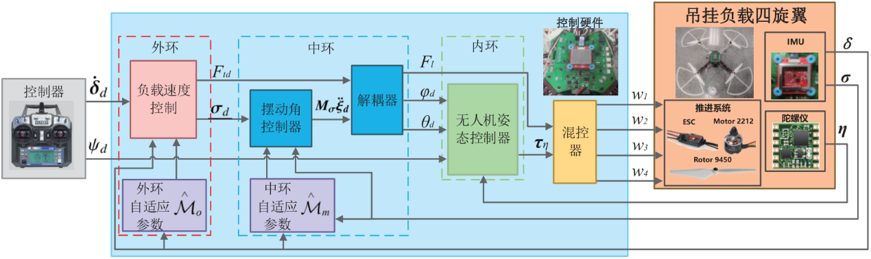 吴玉虎教授团队设计了一种吊挂负载旋翼无人机控制系统,其目的在于通过MSP432E401处理器设计并搭建的四旋翼吊挂负载实验机来解决无人机与负载的稳定飞行控制问题。该设计相较于其他无人机控制系统,具有电路设计合理,整体结构紧凑,适应复杂环境,具有灵活丰富的扩展接口等优势。设计无人机吊挂负载系统专用的非线性串级控制方法,能够实现主动抗摆控制,在主动抗摆控制的基础上设计自适应控制率,抵消了负载不确定质量参数对无人机吊挂负载系统抗摆飞行的影响。所提出的吊挂负载模块结合了万向节与陀螺仪的物理特性,其不易受到环境光和遮挡物的影响,具有重要的实用价值。