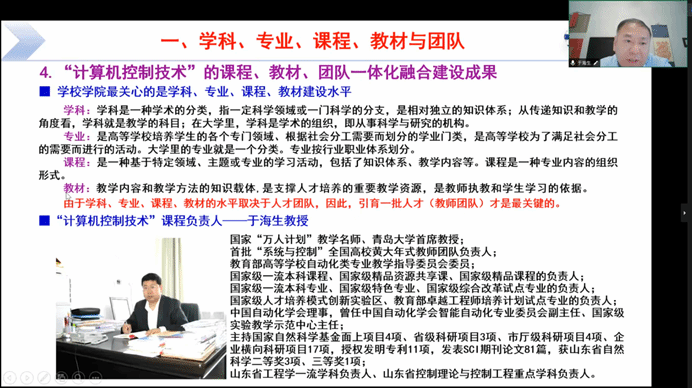 下午15:00开始会议之前,刘涛教授和王开宇教授代表研讨会承办方做了简短开场发言,介绍了组办会议的前期工作和意义。接着请青岛大学国家“万人计划”教学名师于海生教授做了主题为“国家级一流课程、优秀教材和教师团队一体化融合建设——以“计算机控制技术”课程为例”的教学报告。该报告提出了自动化类专业“计算机控制技术”课程的教育理念,阐述了新时代高校课程和教材迫切需要国家级一流课程的多元融合与一体化建设。报告从新工科自动化专业的人才培养方案设计与优化出发,明确了教学学术与教材、课程、团队融合建设的重要性,阐述了国家级一流课程与优秀教材的融合建设方法与建设过程,提供了课程与教材的教学设计案例与教学实践效果,指出了该课程与教材的推广应用与社会影响,并给出了课程的建设特色与创新之处,体现出显著的示范效应和辐射作用。