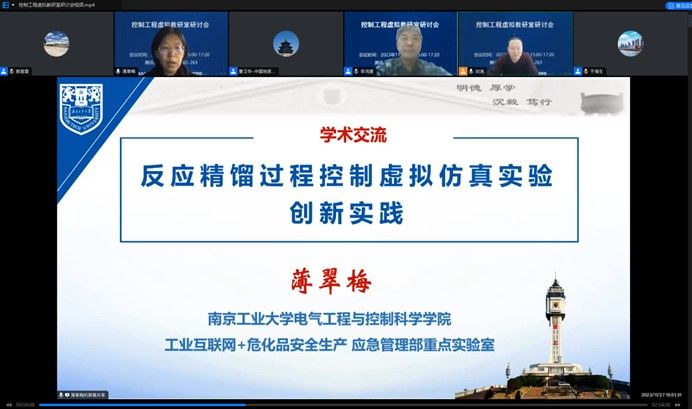 第三位报告人—南京工业大学薄翠梅教授做了主题为“反应精馏过程控制虚拟仿真实验创新实践”的教学报告。该报告介绍了在过程控制工程课程实验教学、综合自动化系统实践中需要引入虚拟仿真技术,开发反应精馏过程过程控制虚拟仿真实验。针对多单元反应与分离生产过程以及反应精馏强化过程,基于严格的动力学过程模型和工业生产数据,分别针对理想物系和醋酸甲酯水解生产对象,建立完备的复杂控制虚拟仿真实验系统,使高危险、不可及或不可逆的反应精馏操作与控制实验课程以及自动化系统实习可以在校内安全地进行,既让学生学到了实践中应该掌握的技术,又保护了学生实践期间的人身安全。