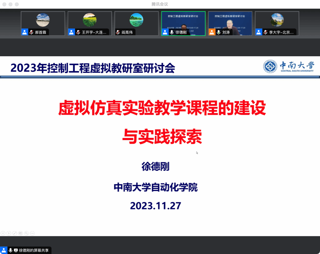 第六位报告人—中南大学徐德刚教授做了主题为“虚拟仿真实验教学课程的建设与实践探索”的教学报告。该报告指出当前虚拟仿真实验教学是推进现代信息技术与实验教学项目深度融合、拓展实验教学内容广度和深度、提升实验教学质量和水平的重要举措,可以有效解决真实实验项目涉及高成本、高消耗、不可逆操作、大型综合训练等问题。围绕“新工科”对于人才培养的要求,以复杂流程多工序的矿物浮选生产过程为主线,构建了过程装备与仪表学习、视觉信号分析与处理、生产反应过程机理建模、浮选柱液位特性测定与控制、药剂添加预估自动控制等五个模块教学内容,开发了“矿物浮选动态反应过程控制虚拟仿真实验”系统,可以交互进行浮选装备认知、常规仪表、智能测量方法、过程建模、DCS系统信号连接,液位PID控制、药剂添加预估控制等实验内容,使学生在自主交互的虚拟环境中完成各类实验,提高学生的综合创新设计能力和工程实践能力。