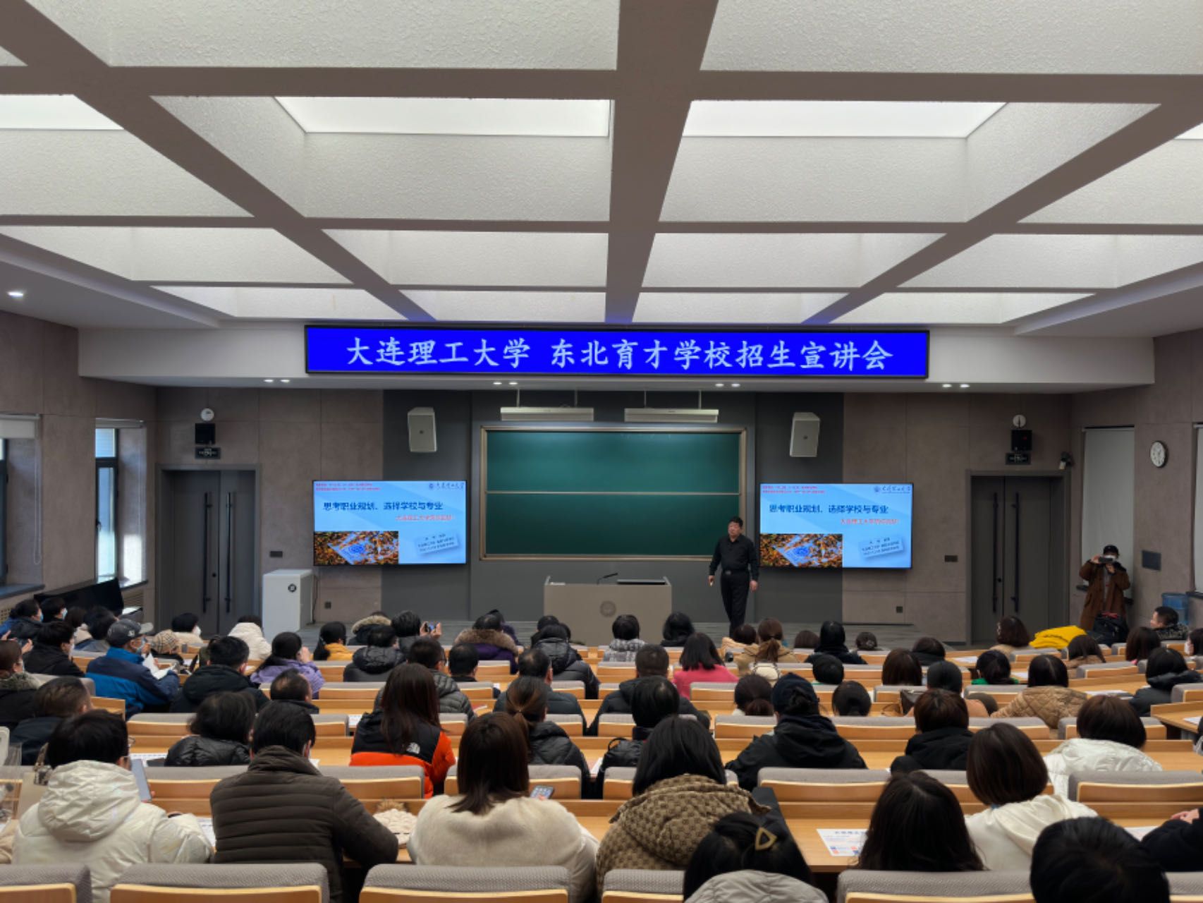 在东北育才学校,洪明面向高三学生家长作《思考职业规划,选择学校与专业》主题报告。报告后,工作组与参会家长进行热烈讨论。控制科学与工程学院副教授、东北育才学校驻点人吕政,控制科学与工程学院招生工作组秘书韩愉随行。