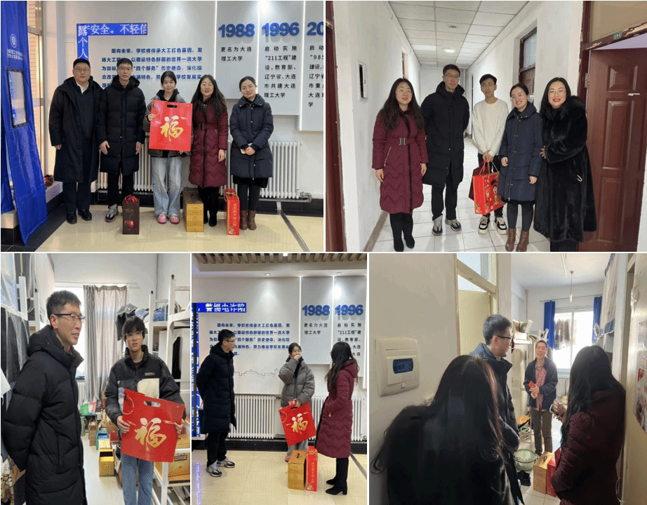 2024年2月8日农历腊月二十九,控制科学与工程学院院长吴玉虎、党委副书记兼副院长高兰以及全体在连辅导员一行走访学院5名留校学生宿舍,看望留校学生,在新春佳节来临之际为同学们送上暖心关怀和新春问候。
