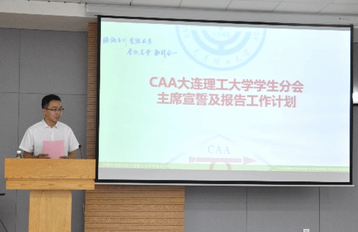 仪式完毕,第一届中国自动化学会大连理工大学学生分会主席孙翀贻进行就职宣誓,并报告CAA大连理工大学学生分会工作计划。