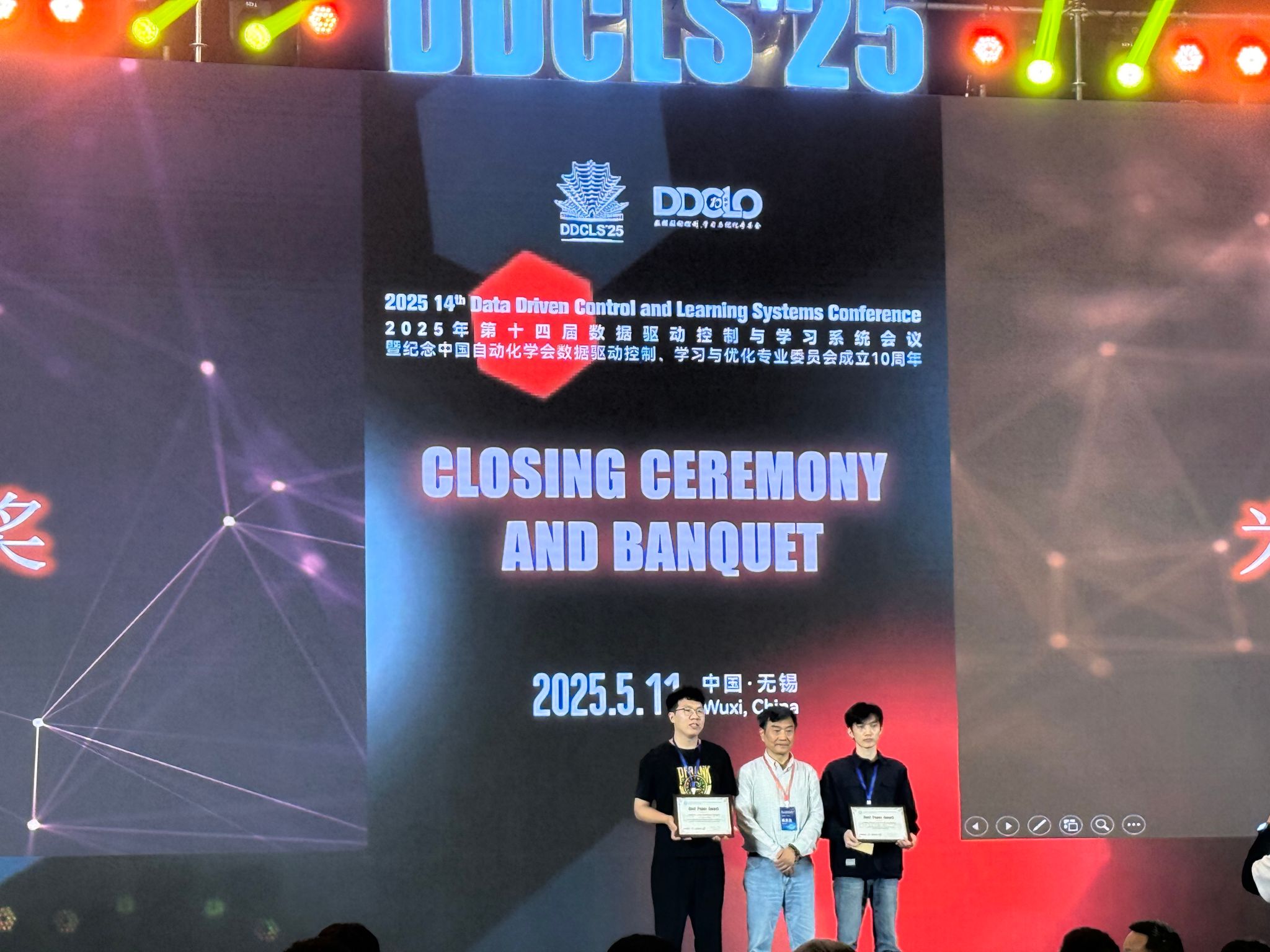 在本届大会上,学院童杰、刘金泽*、陈龙、赵珺、王伟等老师和研究生团队凭借论文《Koopman Operator Learning Control of Dense Medium Separation》脱颖而出,从480篇论文中经过技术委员会初评、盲审专家复审和现场答辩多个阶段层层选拔,荣获DDCLS'25最佳论文奖“Best Paper Award”,成为大会唯二获得此项殊荣的论文!