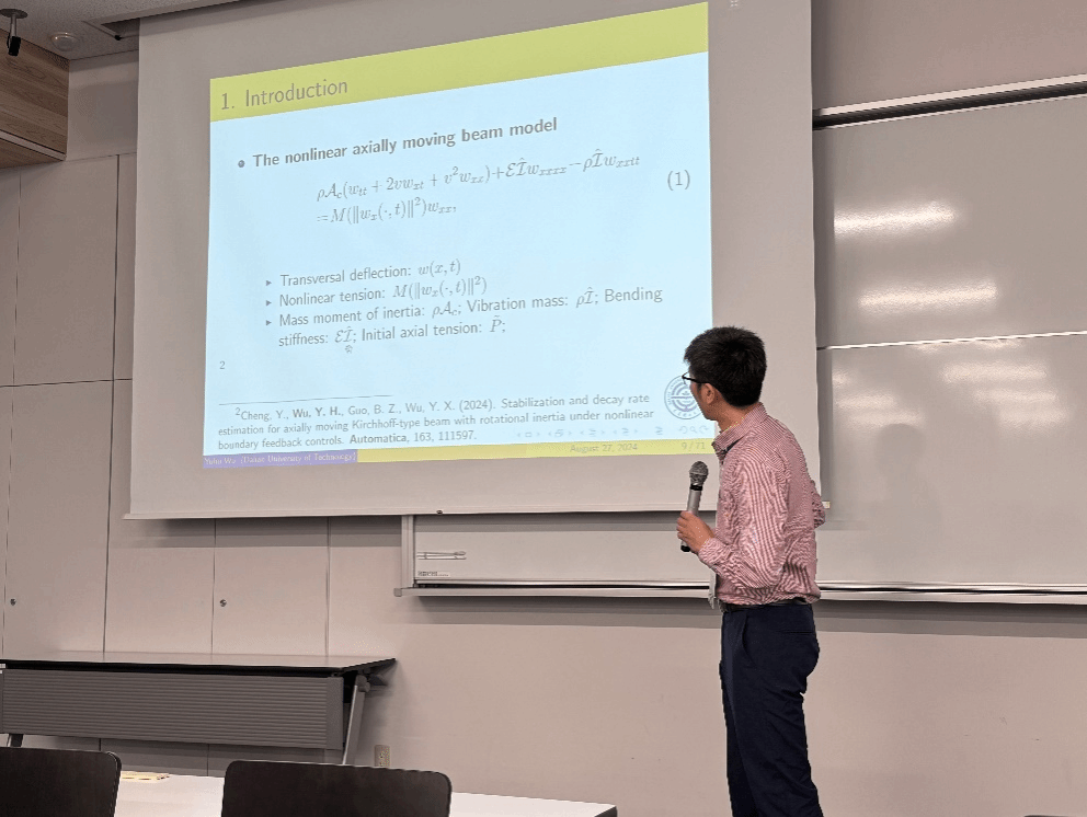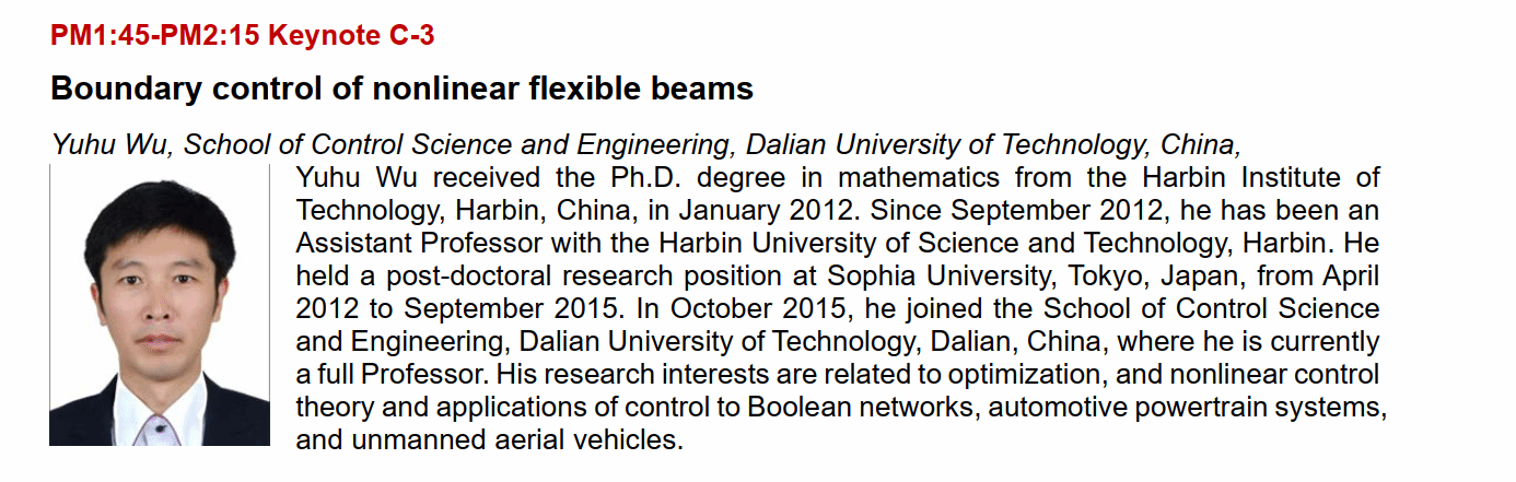 吴玉虎教授受邀作为大会科学指导委员会委员,受邀为大会进行主题汇报,汇报主题为“Boundary control of nonlinear flexible beams”,就柔性梁的边界控制进行了报告,并就自适应控制、车辆控制、无人机控制、数据驱动建模、人工智能等理论方法和工程应用与会议代表进行深入的交流并商谈后续课题合作。此外,吴玉虎教授在访问期间对控制科学与工程学院人才招聘政策进行了宣传。