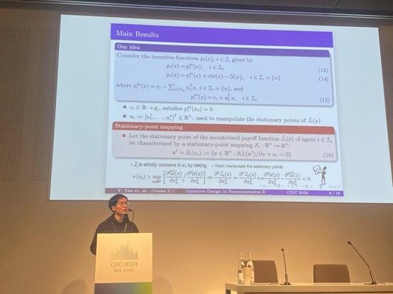 本次大会包括会前讨论、大会报告和分会场报告等相关部分,吴玉虎教授于12月16日抵达米兰,并于当日参加大会。会议期间积极参加了多场大会报告以及分会场报告,与多所高校教授进行学术交流,商讨后续开展学术讨论会及访问合作事宜。吴玉虎教授与合作者投稿了一篇题目为“Incentive design in noncooperative dynamical systems for social welfare maximization using limited payoff information”的学术论文,并于18日在Learning, Optimization, and Game Theory II主题报告厅进行了报告,同时与到场的国内外专家学者积极交流探讨,获得了国内外专家学者的一致认可和好评,进一步提升了大连理工大学控制学院在本领域的学术影响力,增强了本人及课题组成员的科研信心和动力。此外,在会场茶歇期间,吴玉虎教授也和到场参会的部分专家学者进行交流,并对学院招聘人才政策进行宣传,吸引优秀人才加入控制学院。