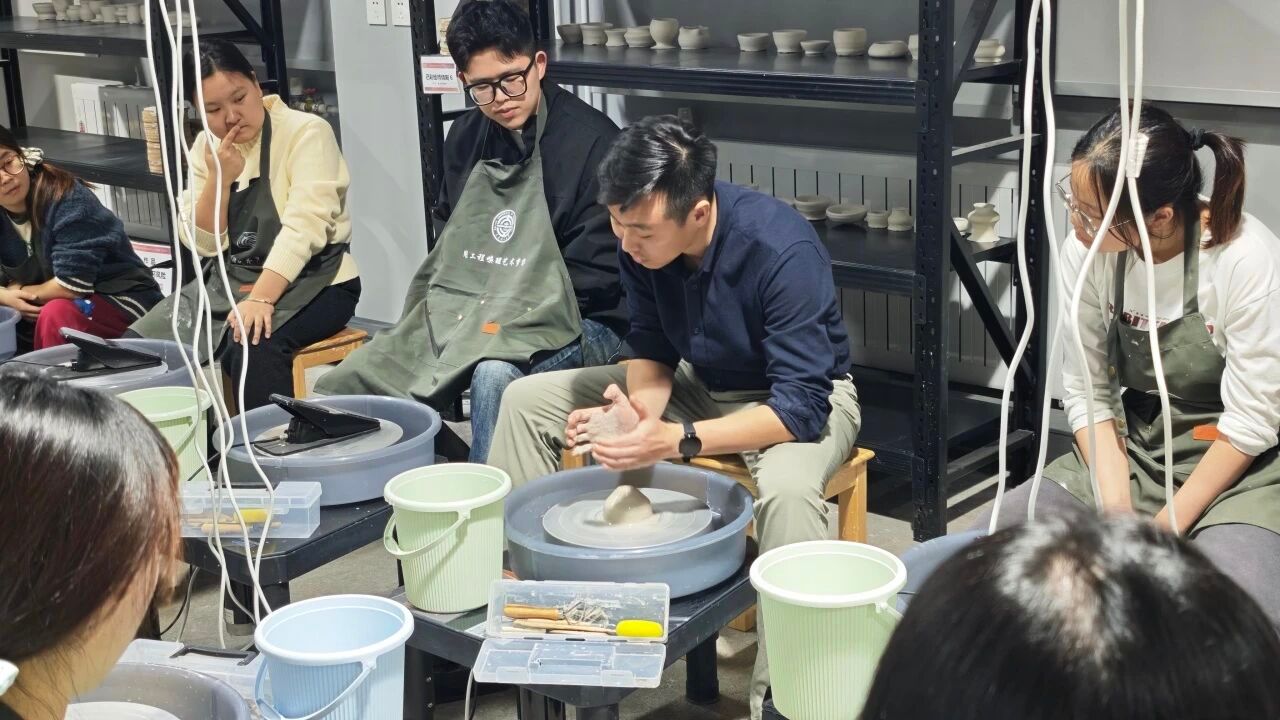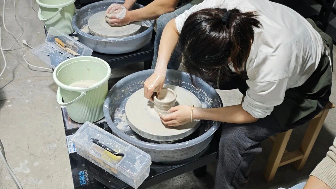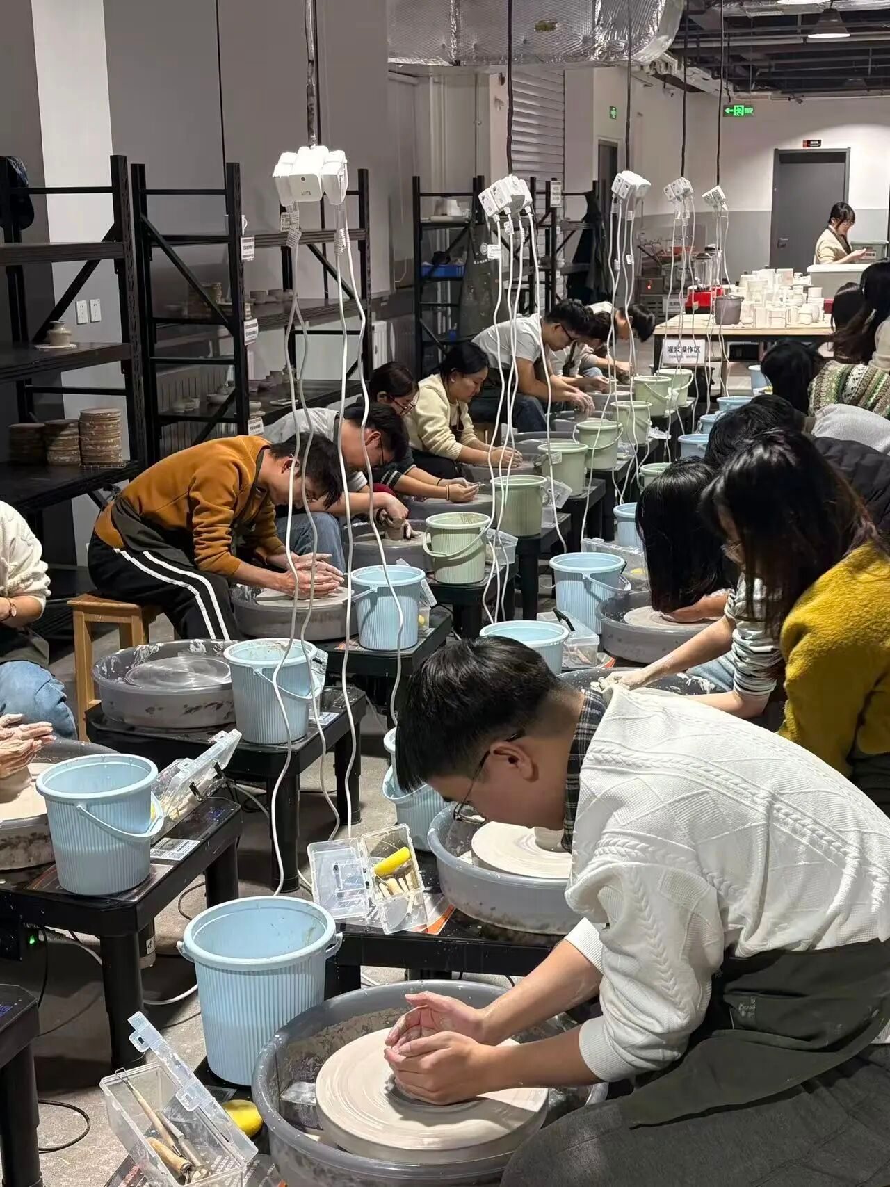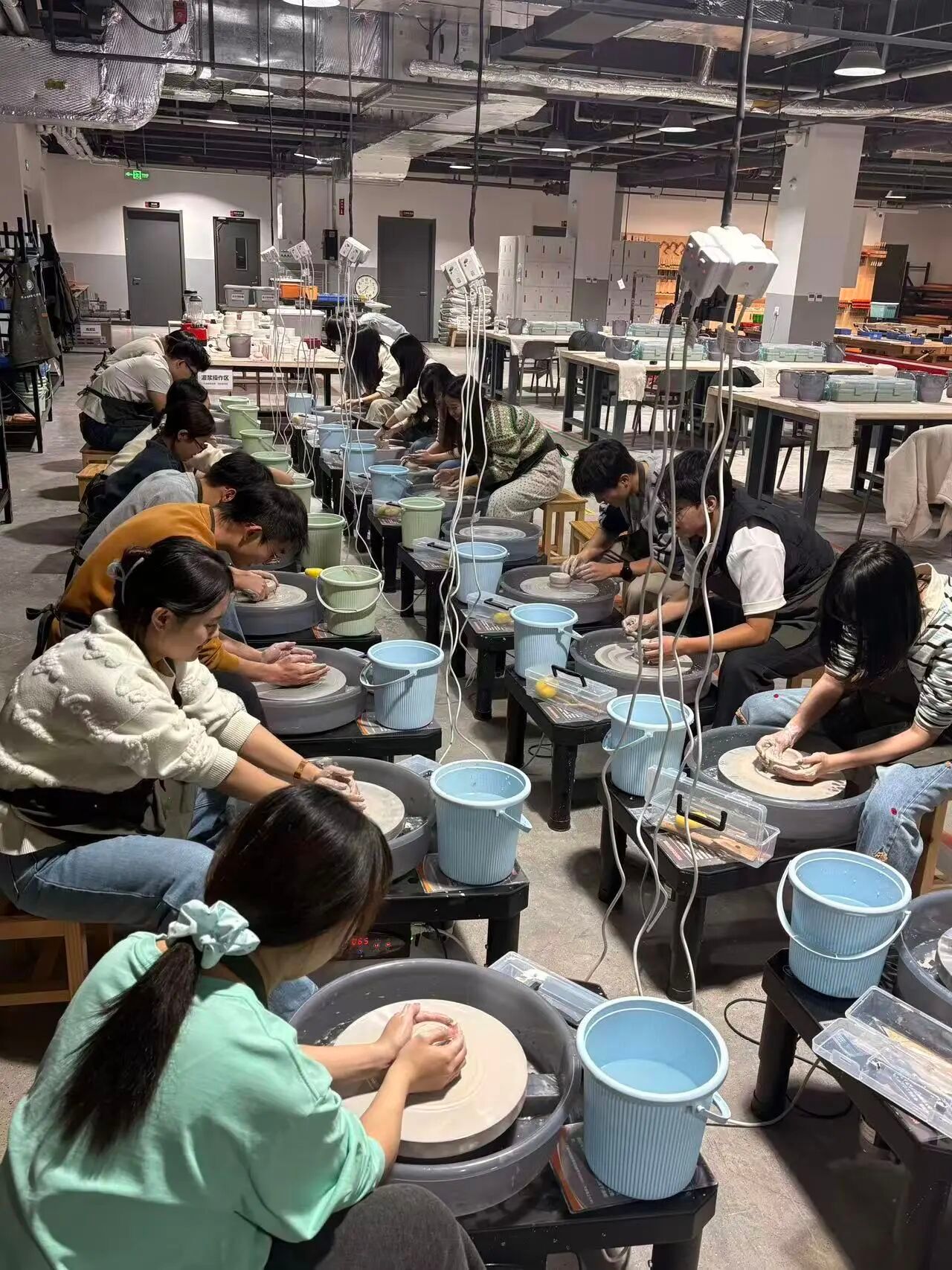 在老师的示范结束后,同学们迅速投入创作。在詹老师和陶韵公社工作人员的耐心引导下,同学们逐渐找到手感:双手轻扶泥料,跟随机器节奏提拉塑形,时而调整重心、修正弧度;有人专注打造实用器皿,有人巧思设计个性摆件,同学们相互交流、彼此支招,整个活动现场,专注的眼神、会心的笑容与机器的转动声交织,满是沉浸式创作的欢乐与温馨。