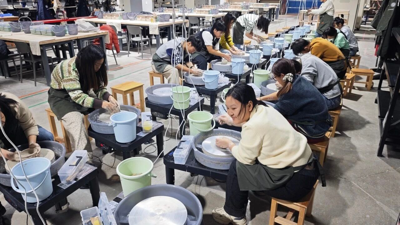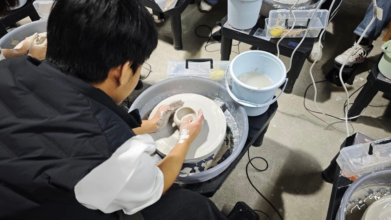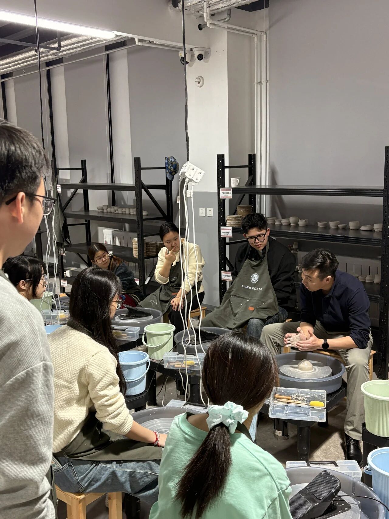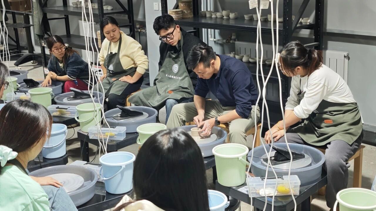 在老师的示范结束后,同学们迅速投入创作。在詹老师和陶韵公社工作人员的耐心引导下,同学们逐渐找到手感:双手轻扶泥料,跟随机器节奏提拉塑形,时而调整重心、修正弧度;有人专注打造实用器皿,有人巧思设计个性摆件,同学们相互交流、彼此支招,整个活动现场,专注的眼神、会心的笑容与机器的转动声交织,满是沉浸式创作的欢乐与温馨。